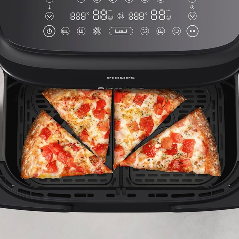 مخزن 7.1 لیتری این دستگاه برای پخت غذای کامل برای حدود 6 نفر در یک وعده طراحی شده و فضای کافی برای انواع گوشت، سبزیجات، مرغ کامل یا ترکیب چند ماده غذایی را فراهم میکند. اما نکته منحصربهفرد، قابلیت تقسیم این مخزن به دو بخش مساوی با استفاده از جداکننده مخصوص است. این ویژگی، تحت عنوان مخزن Flex شناخته میشود و امکان پخت دو نوع غذا بهطور همزمان بدون ترکیب طعمها و روغنها را فراهم میسازد؛ قابلیتی که تاکنون در هیچیک از مدلهای هواپز فیلیپس ارائه نشده بود. فقط تعداد محدودی از مدل های هواپز دوقلو مخزنی با این نوع خاص طراحی را دارند.